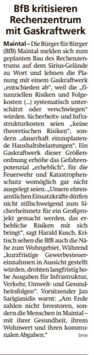 Titel: BfB kritisieren Rechenzentrum mit Gaskraftwerk